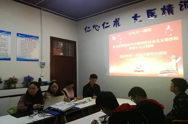 (通讯员蒋秋萍王孟文)20181018日,十九大召开一周年之际,临床医学一支部在大田湾校区仁心特色成长辅导室举行了主题党日活动,主题主要围绕“学习习近平新时代中国特色社会主义思想”及“加强五化建设,争做优秀党支部”两方面进行。支委书记丁晓岚老师、宣传委员向红老师、组织委员张惠娟老师组织本次活动,参加本次活动的人员有学生预备党员发展对象以及入党积极分子。