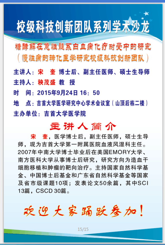 当前位置: 首页» 科学研究» 学术活动 校级科技创新团队系列学术沙龙 时间:2015-09-24 点击: 作者:佚名 上一条:外泌体MIR在心血管中的研究进展 下一条:2015-2016年第一学期学术报告安排 【关闭】