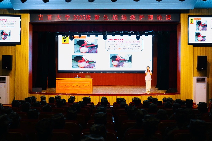 实操课堂中,红十字会讲师以标准跪姿俯身模拟人旁展开示范,手掌交叠、肘部绷直,胸外按压动作连贯规范、节奏精准。在创伤包扎环节,讲师手持三角巾,逐步拆解不同部位包扎方法步骤,并强调其中细节把控。一旁身着迷彩的新生眼神紧紧盯着老师的手部动作,全神贯注的模样充分体现对急救操作规范性的重视。