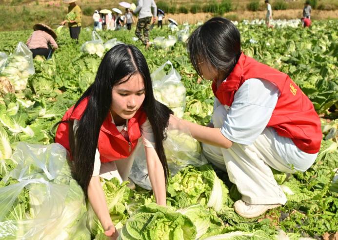 上午的白菜地里,青年志愿者们身着红马甲、手持采摘袋,与村民一同投入抢收工作中。经验丰富的“老把式”埋头苦干之余不忘向年轻生手传授技艺,志愿者们虚心学习,不甘落后,在实践中熟能生巧。采摘、分拣、搬运……一时间,田间地里的“红背心”“绿菜头”形成一道亮丽的风景线。