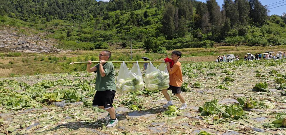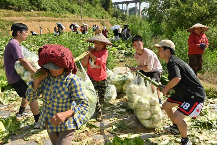 (图为村民与志愿者挑运白菜)