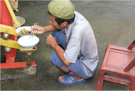 义诊开始前,河溪镇卫生院高副院长向老人们介绍了我们团队,由张钰华老师向老人们道明我们此次活动的目的。张正光爷爷是名先天聋哑患者,有76岁高龄了。看到我们的到来,爷爷脸上一直洋溢着笑容,嘴里不停地嘤嘤叫唤着,活像个天真烂漫的孩子般。在志愿者与老人们的交谈中,我们了解到老人们每天只吃2顿饭,吃饭有时间点,菜色是荤素搭配。细心地志愿者发现,爷爷很珍惜粮食。他喜欢蹲着吃饭,饭和菜是分开装的,爷爷一只手用筷子把饭送进嘴里,另一只手一直护着米饭,倘若掉下一粒米,爷爷都会用筷子把那一粒米夹起来吃掉。平日我们在学校,若是觉得饭菜不合胃口,就直接整盘倒掉。而这位爷爷的这一举动,着实给我上了一堂深刻的教育课:谁知盘中餐,粒粒皆辛苦。