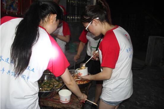 晚上8点整,停电了的河溪镇陷入一片漆黑,一座民房院子前闪烁着温暖的烛光。英国威廉集团领队老师们在厨房里为队员们准备着丰盛的晚餐,同学们看着老师们被汗浸湿的衣襟,心中充满着感恩。“这是我的第二碗饭!”指导老师彭校辉朗声说到。色香味俱全的餐食填饱了每位同学的肚子,老师们在温暖烛光下的剪影也温暖了每个团队成员的心。