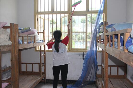 “看这些大学生,这么热的天,怕是一天也坚持不了。”看着志愿者们顶着烈日,扛着行李住进河溪镇河溪小学,在小学门口乘凉的“李大叔”说到。“刚刚来怎么就停电了!”有同学感叹道。毒辣的太阳烘烤着河溪的大地,同学们的衣服干了又湿,湿了又干,可是都没有停下手中的事,“大家分工合作赶快把卫生打扫干净。”带队老师李继红说到。老师们也动手和同学们一起整理宿舍,看着变得整洁的宿舍,都露出了欣慰的笑。