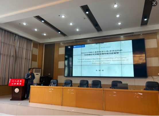 报告会上,朱耀峰博士从研究背景引出科学问题,讲解研究结果与讨论,汇报RAGE如何介导帕金森病纹状小体/基质组构的中间神经元突触及维环路功能重塑,为同学们分享了关于PD病理学机制的研究。