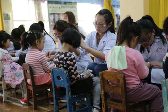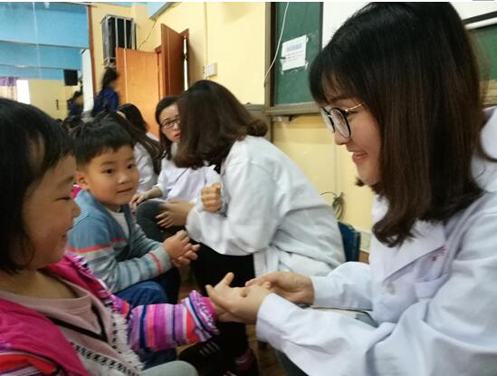 在同学们多日的翘首中,本次活动如约而至。4月13日下午14时,在针灸推拿系主任邓瑜老师、刘氏小儿推拿传承人刘盈盈老师的带领下50名针推学子有组织有纪律地抵达德雅幼儿园。本次活动采取一对一式服务方式,为4-5岁的50名幼儿做益智健体,增强免疫力的小儿推拿保健服务。