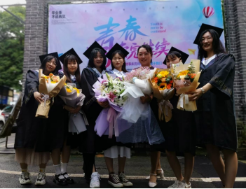 图为毕业生和老师们在校园合影留恋
