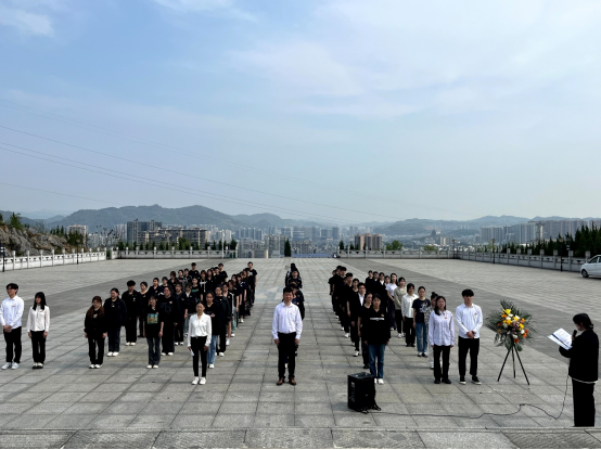 学生代表上前敬献花篮,全体肃立默哀一分钟,寄托对革命先烈们的无限哀思。学院学生第二党支部宣传委员张罗琴老师带领全体师生在烈士碑前庄严宣誓:我们将继承英烈们的遗志,人民为先,祖国至上,发扬勇往直前,无坚不摧的革命精神。抛弃懒散与柔弱,告别散漫与消极;以坚强的意志、严明的纪律、崭新的面貌、积极的状态,投入到学习生活中去;以我壮志豪情,创造崭新未来,以我火红青春,建设锦绣中华!