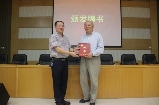 钟海平代表学校对唐朝枢教授的受聘表示热烈祝贺,对他给予我校的关心与支持表示衷心的感谢,并为唐朝枢颁发了聘书。