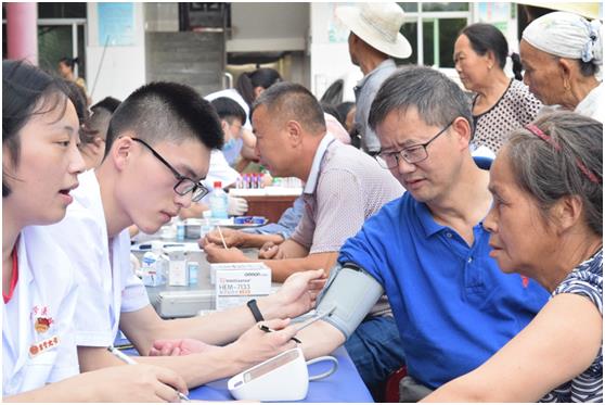 图为健康扶贫队员为前来指导工作的龙先琼副校长测量血压